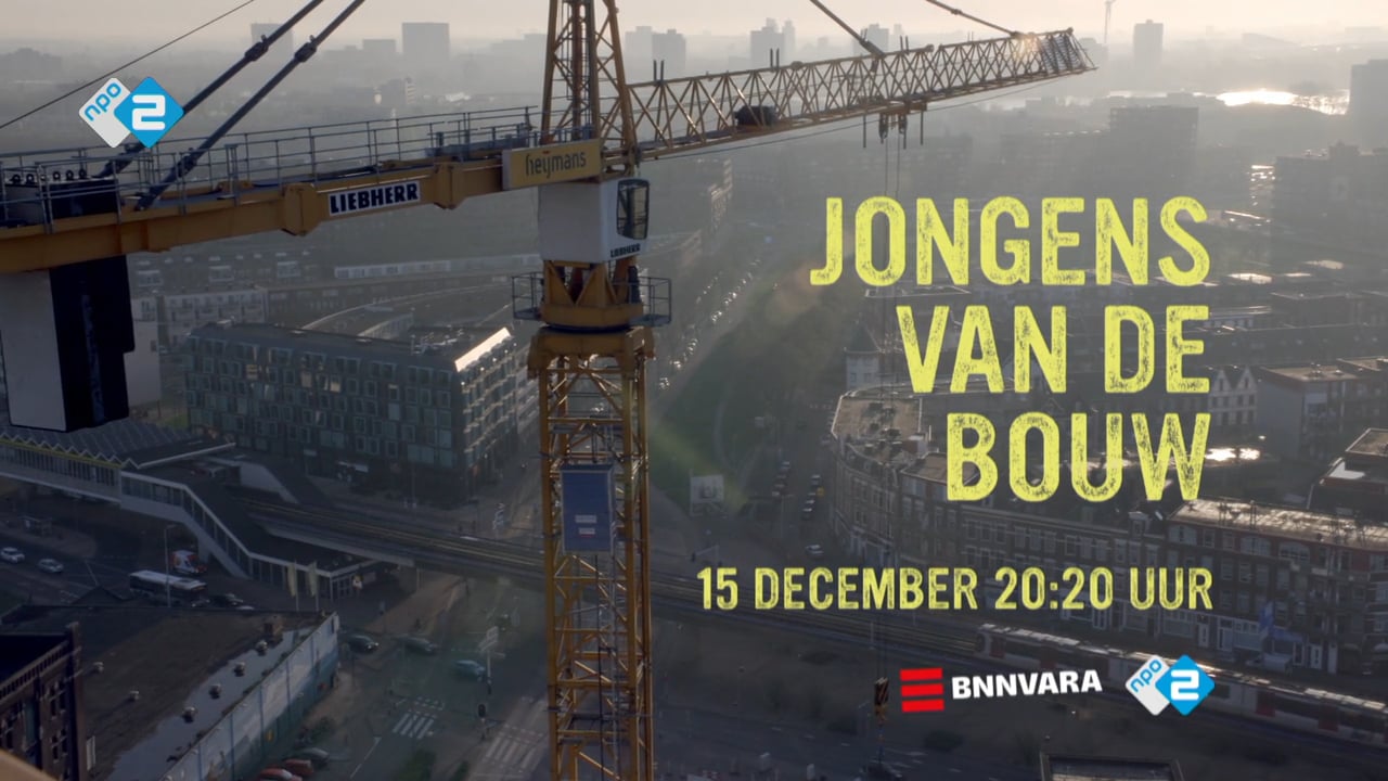JONGENS VAN DE BOUW (NPO2/BNNVARA) Uitzending: 15 december 2019. Door een nijpend tekort aan woningen verrijzen overal in de Randstad woontorens. Documentairemaker Geertjan Lassche volgt twee jaar lang een bouwproject in hartje Rotterdam, van eerste paal tot oplevering.