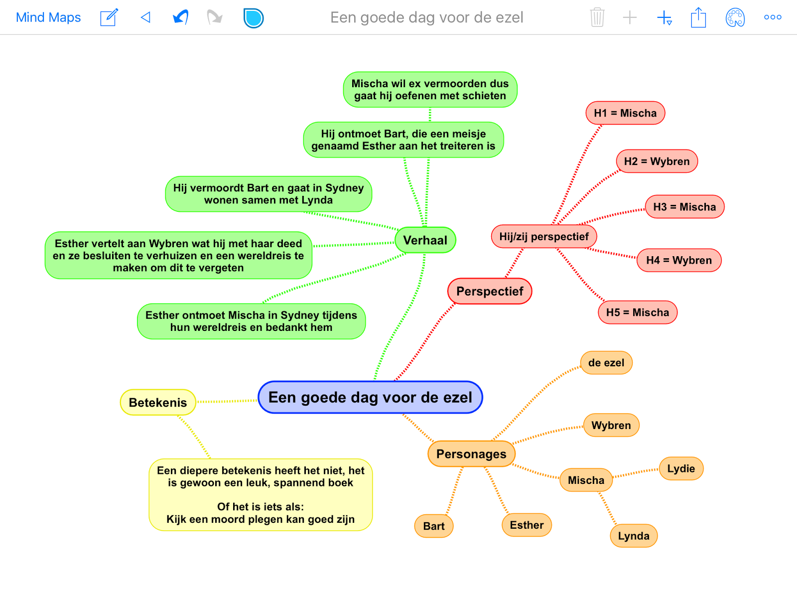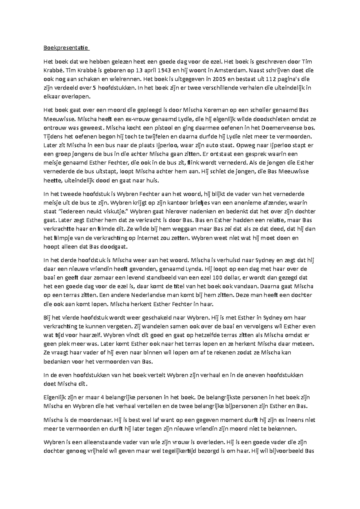 Opdracht niveau 1 | Verhaallijnen. De gebeurtenissen worden in dit boek bepaald niet chronologisch verteld. Bovendien is er sprake van twee verhaallijnen: een van Mischa Koreman en een van Esther en Wybren. In deze opdracht gaan jullie onderzoeken wat beide verhaallijnen met elkaar te maken hebben. Titel. Een goede dag voor de ezel. Niveau boek.