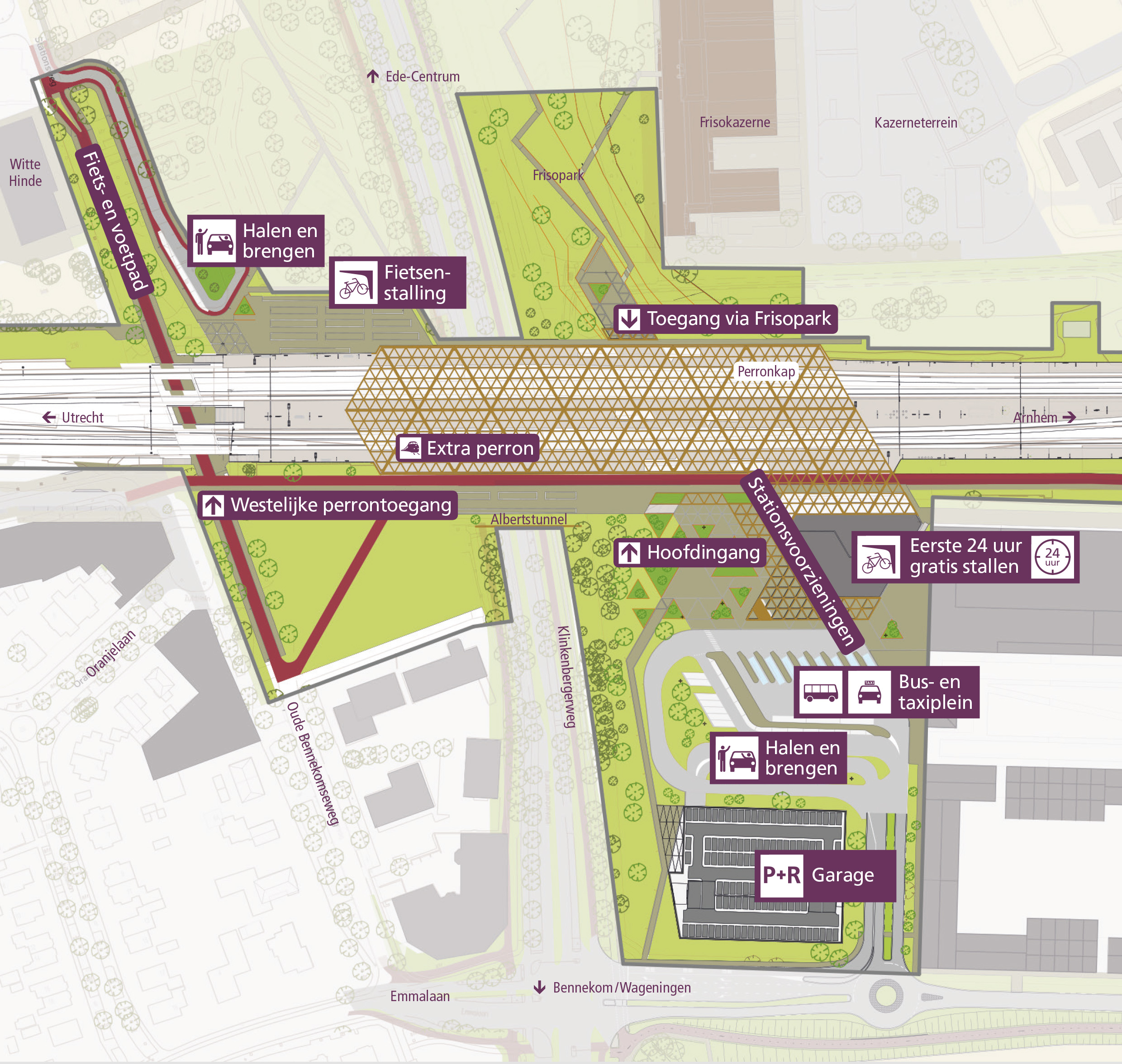 Reizigers kunnen hier hun auto parkeren en vervolgens via perron 1 het nieuwe station inlopen. ROUTEKAART. Op de onderstaande routekaart zijn de nieuwe routes voor het bereiken van het nieuwe station afgebeeld. Meer informatie over de opening van het nieuwe station Ede-Wageningen en diens bereikbaarheid kan je hier vinden.