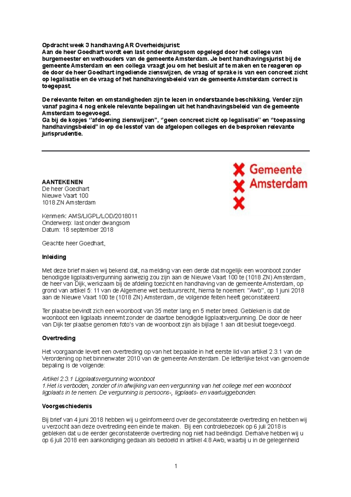 Casus Last onder dwangsom Opdracht week 3 handhaving AR Overheidsjurist Aan de heer Goedhart